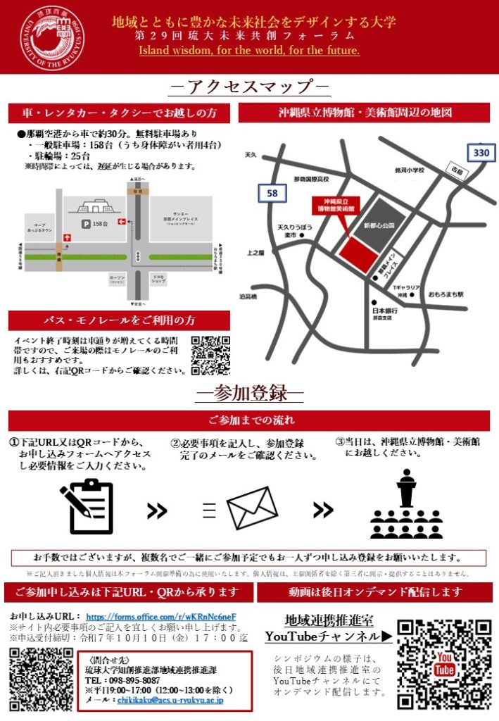 <第29回 琉大未来共創フォーラム>を下記のとおり開催いたします。このフォーラムは、琉球大学のビジョン「地域とともに豊かな未来社会をデザインする大学」の実現に向け、地域社会とのコミュニケーションの場として位置づけております。多くの皆様のご参加をお待ちしております。