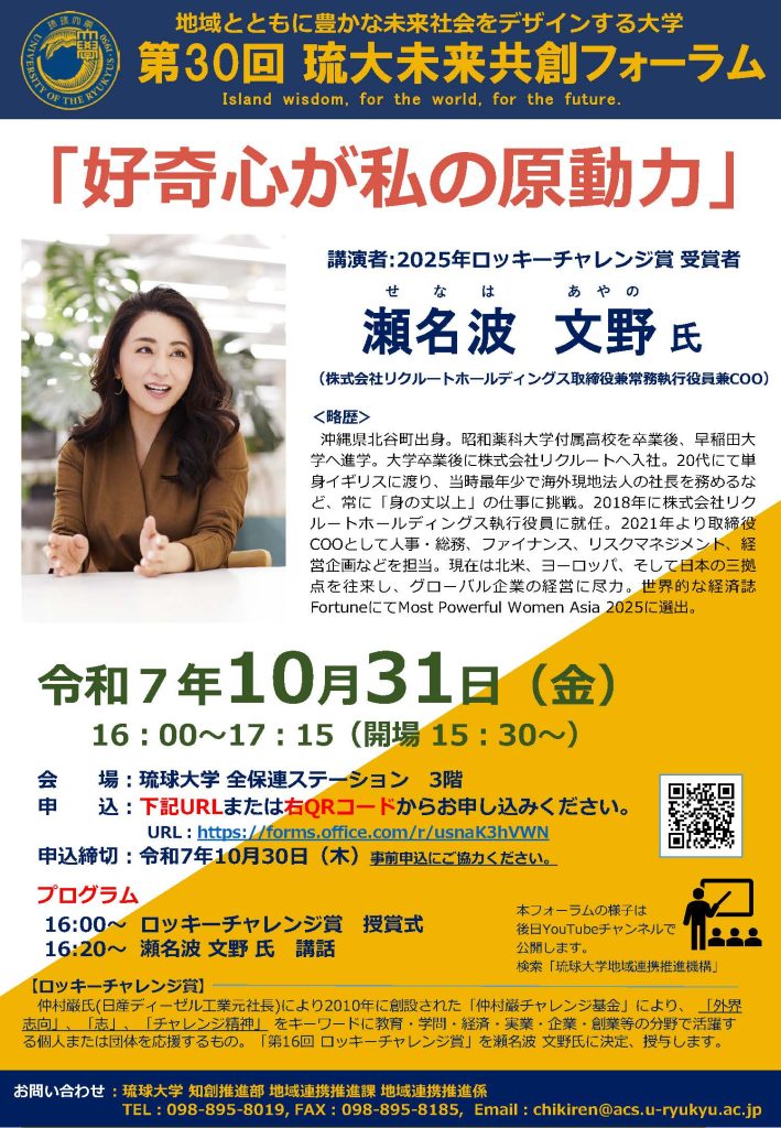 【お知らせ】第30回琉大未来共創フォーラム ロッキーチャレンジ賞受賞講演「好奇心が私の原動力」を開催します